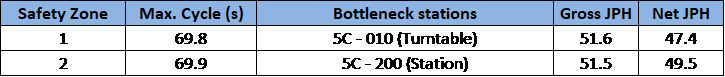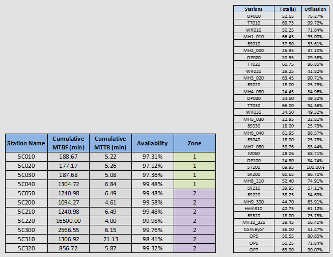Particularly, Station 5C-010's material handling robot was found to be a chronic bottleneck, having the highest utilization and lowest availability in Zone 1. The other bottlenecks were 5C-030 and 5C-200, suggesting an upstream clustering of performance limitations. Line efficiency was computed at 93.4%, while machine availability throughout zones varied between 97% and almost 100%. The analysis also validated that the proposed buffers between downtime areas were adequate under existing operational conditions, avoiding cascading delays and preserving continuity of flow.